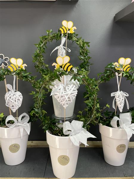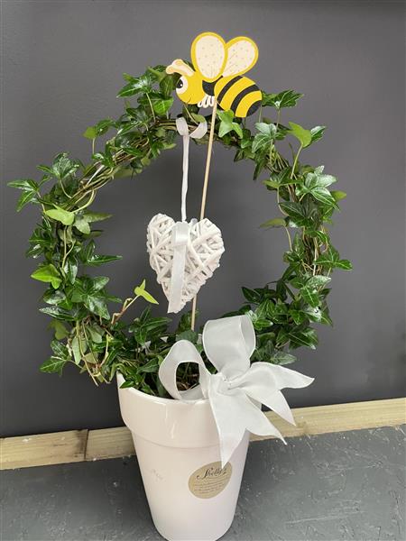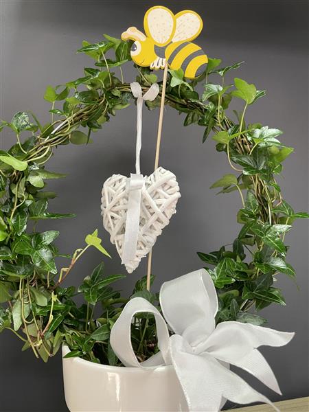 Ivy arch plant in a white ceramic pot. Decorated with a hanging white wooden heart, pretty bow and a bumble bee pick.
